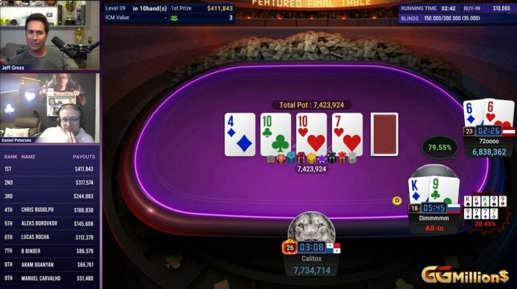 With four players left, it was ‘72oooo’ who held a massive lead with 12.4 million chips, with ‘Dimmmmm’ (3.85m), Calitox (3.42m), and Chris Rudolph (2.3m) all trailing well behind the leader’s wake. Next out was Rudolph, who was unlucky to bust in fourth place for $188,830 (3:17:30) when his ace-nine of diamonds was shot down by Calitox’s king-ten of the same suit. A nine-high flop meant Rudolph was a 74.65% favorite to double up, but after an innocuous seven on the turn, an eight on the river gave the Panamanian the unlikeliest of runner-runner straights to send play three-handed.
