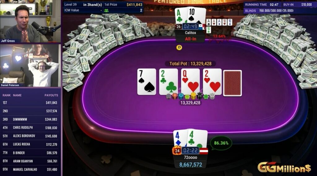 This week, the GGMillion$ action saw the shortest stack of all come back from the brink to reign supreme, taking home the top prize of $411,843. With regular host Jeff Gross joined in the virtual commentary booth by the Danish GGMillion$ regular Daniel Petersen, the action was fast and frantic from the very first card, with an evenly spread set of chipcounts at the start of play.