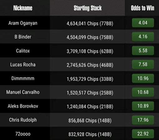 Heading into the action at the final table, it was the Armenian-American player Aram Oganyan who had the chip lead on 77 big blinds. It was no surprise that he was the betting favorite at 4.04 in the GGPoker client. That was only a marginal advantage over recent Triton Jeju and WSOP Super Main Event champion Bernhard Binder. At 4.16, the Austrian was our pick to take the title, given his recent success and stack of 75 big blinds.