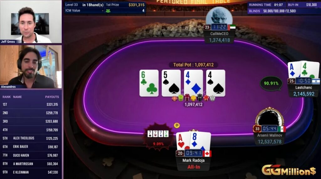 This week’s pre-Christmas GGMillion$ was one of the most enjoyable of the year, as Jeff Gross played Santa Claus as regular host and was joined by his cheeky elf-like sidekick Alexandros Kolonias in the virtual booth. With the Russian player Arsenii Malinov taking a huge lead into the action, the online poker boss bullied his opponents in a frankly ludicrous masterclass of chip dominance to win the last GGMillion$ title before the Yuletide period.