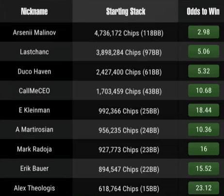 Despite starting behind the top five, the record-holding GGMillion$ winner Artur Martirosian was only available at odds of 10.36 with 23 big blinds. The Russian was followed in the counts by Canada’s Mark Radoja (23BB/16) with outsiders Erik Bauer (22/15.52) and Greek Online Poker Millionaires star Alex Theologis (15/23.12) both hoping for an early double to fire themselves back into contention.