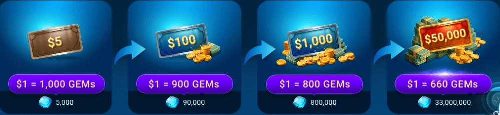GEMs are exchanged for cashback through the rewards shop, and the exchange rate improves as you cash in larger amounts. For example, trading 5,000 GEMs will get you $5 (valued at 1,000 GEMs per $1), while trading 45,000 GEMs will get you $50 (valued at 950 GEMs per $1), and trading 90,000 GEMs will get you $500 (valued at 900 GEMs per $1).
