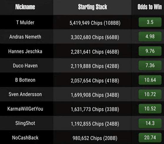 Heading into the GGMillion$ final table, Dutch player Teun Mulder started with 108 big blinds and as a result was only available at odds of 3.5 in the GGPoker client. A hot favorite, he was a great bet to win, but so too was the second in chips Andras Nemeth, the Hungarian, having 66 big blinds at odds of 4.98. German player Hannes Jeschka sat some way back on 46 big blinds at odds of 9.76, and was followed by our pick for the win, Mr. Consistent himself, Duco Haven (7.36) on 42 big blinds at yet another recent final table.