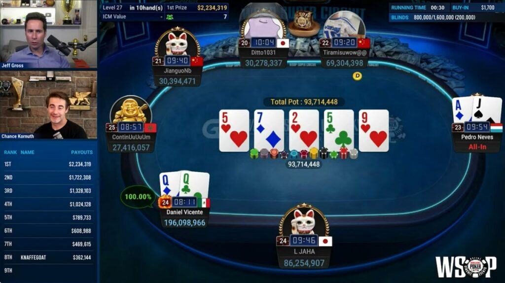 Vicente built on that early elimination and grew his stack to over 240 million chips, miles clear of his nearest challenger, ‘L JAHA’ on 86m chips. Even more chips came the Spaniard’s way after cracking the 240M mark when former GGMillion$ winner Pedro Neves shoved pre-flop with ace-jack (1:05:15). Vicente called correctly with pocket queens. A nine-high board was all the Spanish player needed to see, as one of the most dangerous players at the table was busted in seventh place for $469,615, while the chip leader was now sitting with over 50% of the chips in play.