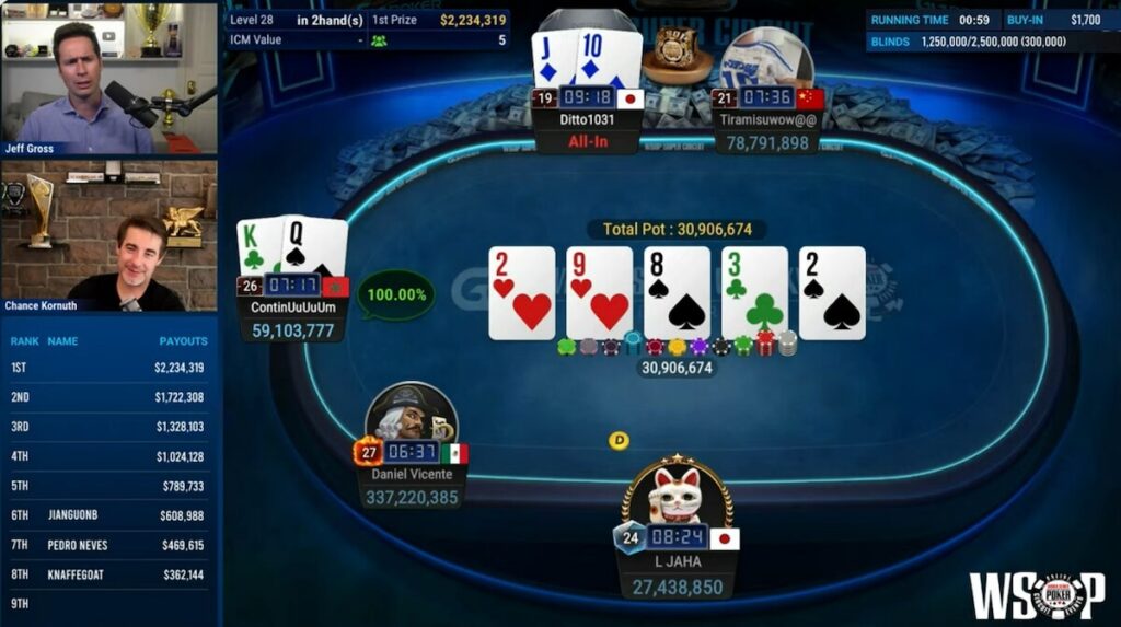 With four players left, Vicente still had a huge lead with 337 million chips, while everyone else was sitting under nine figures. ‘ContinUuUuUm’, who started play in 7th, was sitting second on 90 million. In ‘Tiramisuwow@@’ was in third with 78m, and ‘L JAHA’ was down to just 27 million, the equivalent of just 11 big blinds. It was no surprise when the Japanese player ‘L JAHA’ departed, but it was a cruel ending. The board played out K-8-7-7-Q, leading to the second Japanese player in a row departing after a bet that was raised all-in by ‘ContinUuUuUm’. ‘L JAHA’, turning over queen-eight for 2 pair, only to see the king-three from his opponent for a better two-pair. The field was down to three as ‘L JAHA’ left the final table with $1,024,128 for finishing in fourth place.