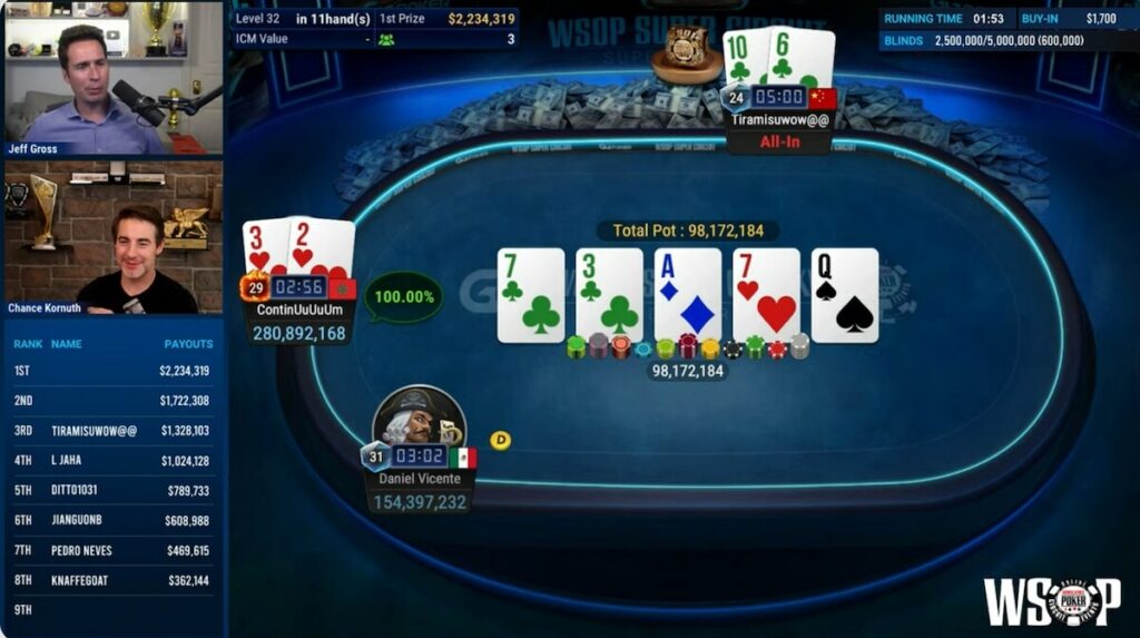 That was only a stay of execution, however, as the Chinese player’s tournament ended soon after. On a flop of A-7-3 with two clubs, ‘ContinUuUuUm’ moved all-in and Tiramisuwow@@ called with ten-six of clubs (2:27:30). Despite an offsuit seven coming on the turn, the Chinese players still had a 38% shot at victory to the river as per the on-screen odds displayed on GGPoker, but ‘ContinUuUuUm’ held as the queen of spades sent play heads-up as ‘Tiramisuwow@@’ went home with $1,328,103 in third place.