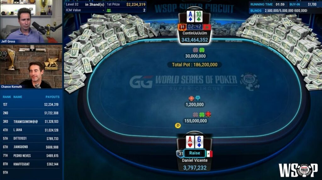 The $15M GTD WSOP Super Circuit Online Main Event was whittled down to eight players on Sunday night, as players broke for the night after a double knockout, ready to reconvene on Tuesday for the final table. Playing down to a winner and a top prize of over $2.2 million, the last eight saw their journey brought to life, live on GGPoker TV. The excitement was shared by regular host Jeff Gross and this week’s special guest co-commentator, multiple WSOP bracelet winner and legendary poker player and coach Chance Kornuth. It was a dramatic finale befitting the occasion as legends fought for glory and the latest World Series of Poker title and gold circuit ring.
