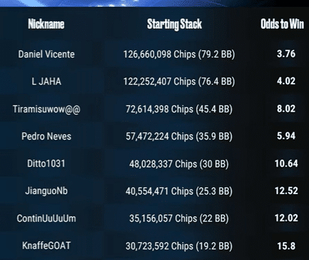 Chinese player ‘Tiramisuwow@@’ was sitting third on 45 bigs at odds of 8.02, but we loved the value of Pedro Neves. The Portuguese player, playing from the Netherlands, was 5.94 to bet on with 36 big blinds, a more than playable stack for the experienced professional. Japan’s second representative, ‘Ditto1031’, was on 30 bigs at odds of 10.64, while China’s ‘JianguoNb’ (25BB/12.52). Moroccan threat ‘ContinUuUuUm’ (22BB/12.02) and Israel’s ‘KnaffeGOAT’ (19BB/15.8) were all hoping a strong start would boost them back in the running.