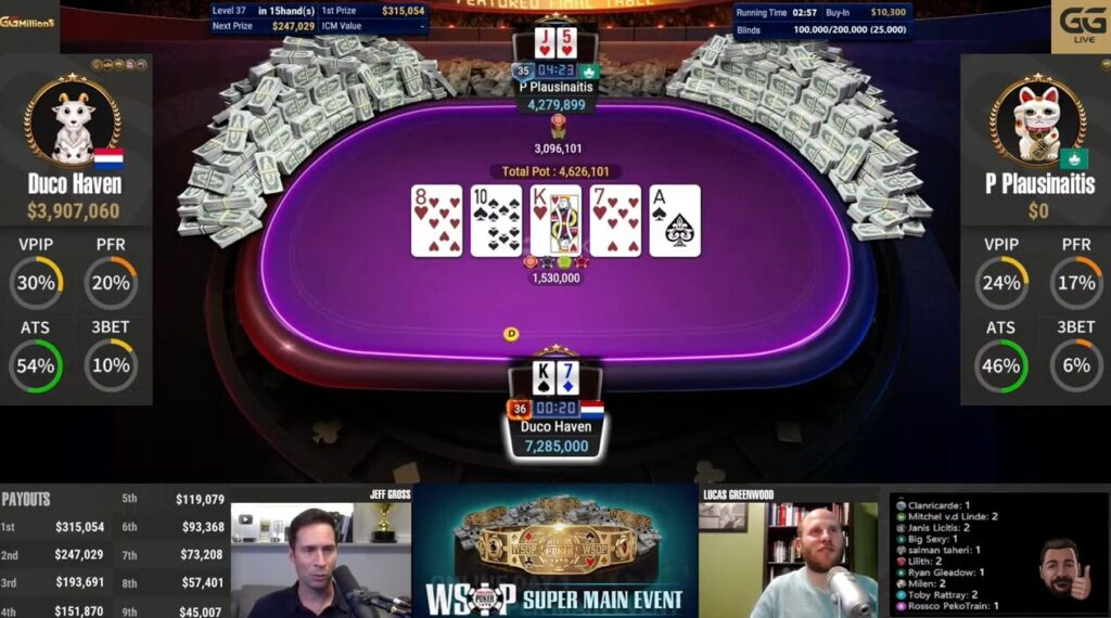 Heads-up, the overnight chip leader Duco Haven started with 5.4 million as he made a bid to win his fifth GGMillion$ title. He was facing off against the potential first-time Plausinaitis, who started the final duel on 10.7m chips. Haven had to bide his time but dominated his way into the lead when his ace-king conquered Plausinaitis’ ace-nine, a flop coming K-8-2-7-T to flip the script.