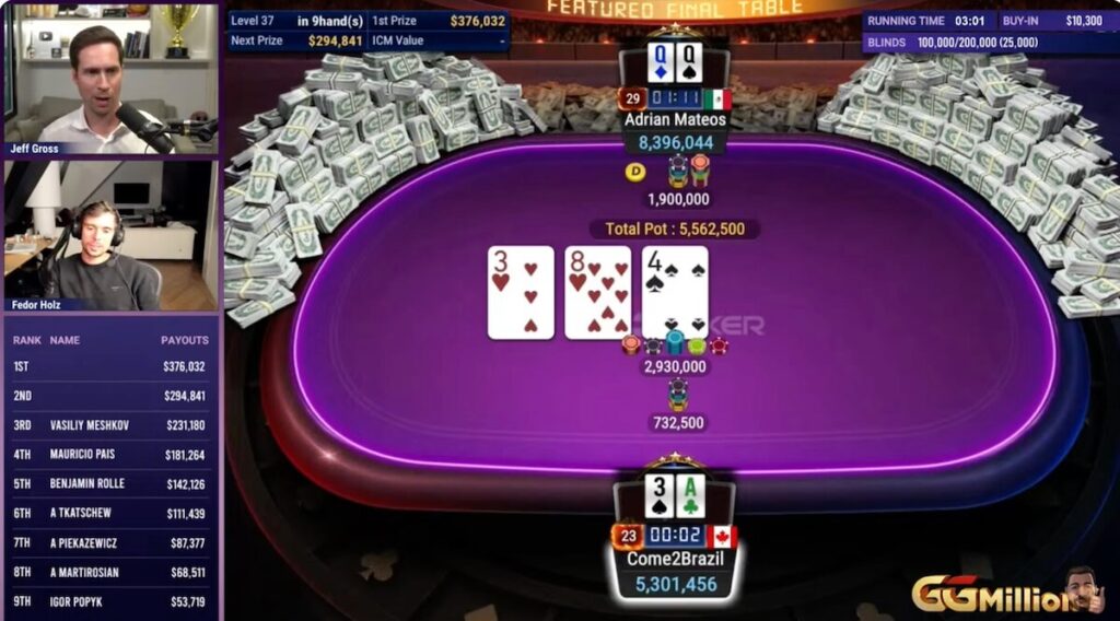 With nine players heading into the final table, the leader was Fedor’s fellow German, an online poker coach himself, Benjamin Rolle, with 79 big blinds. There was a decent gap to second-placed Canadian ‘Come2Brazil’ with 55 big blinds. Marginally behind were Spanish legend Adrian Mateos (54BB) and another German player, Alexander Tkatschew (53BB). Russian duo Vasiliy Meshkov (41BB) and Artur Martirosian (38BB), also known as the king of GGMillion$, were next, with Mauricio Pais (36BB), Ukraine’s Igor Popyk (18BB) and Brazilian Alisson Piekazewicz (12BB) hoping for a lightning start to get back into the game.