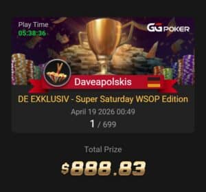 Kurios dabei: Dass er am Samstagabend neben dem Turniersieg auch noch ein WSOP Main-Event-Ticket obendrauf gewonnen hatte, war David zunächst gar nicht richtig bewusst. Zwar hatte er in der Turnierlobby „irgendwas von Las Vegas“ gelesen, allerdings war er davon ausgegangen, dass es sich um eine Serie handelt und am Ende der punktbeste Spieler den großen Preis erhält. Erst zwei Tage später, als das Ticket seinem Spieleraccount gutgeschrieben wurde, wurde ihm endgültig klar, was da überhaupt passiert war.