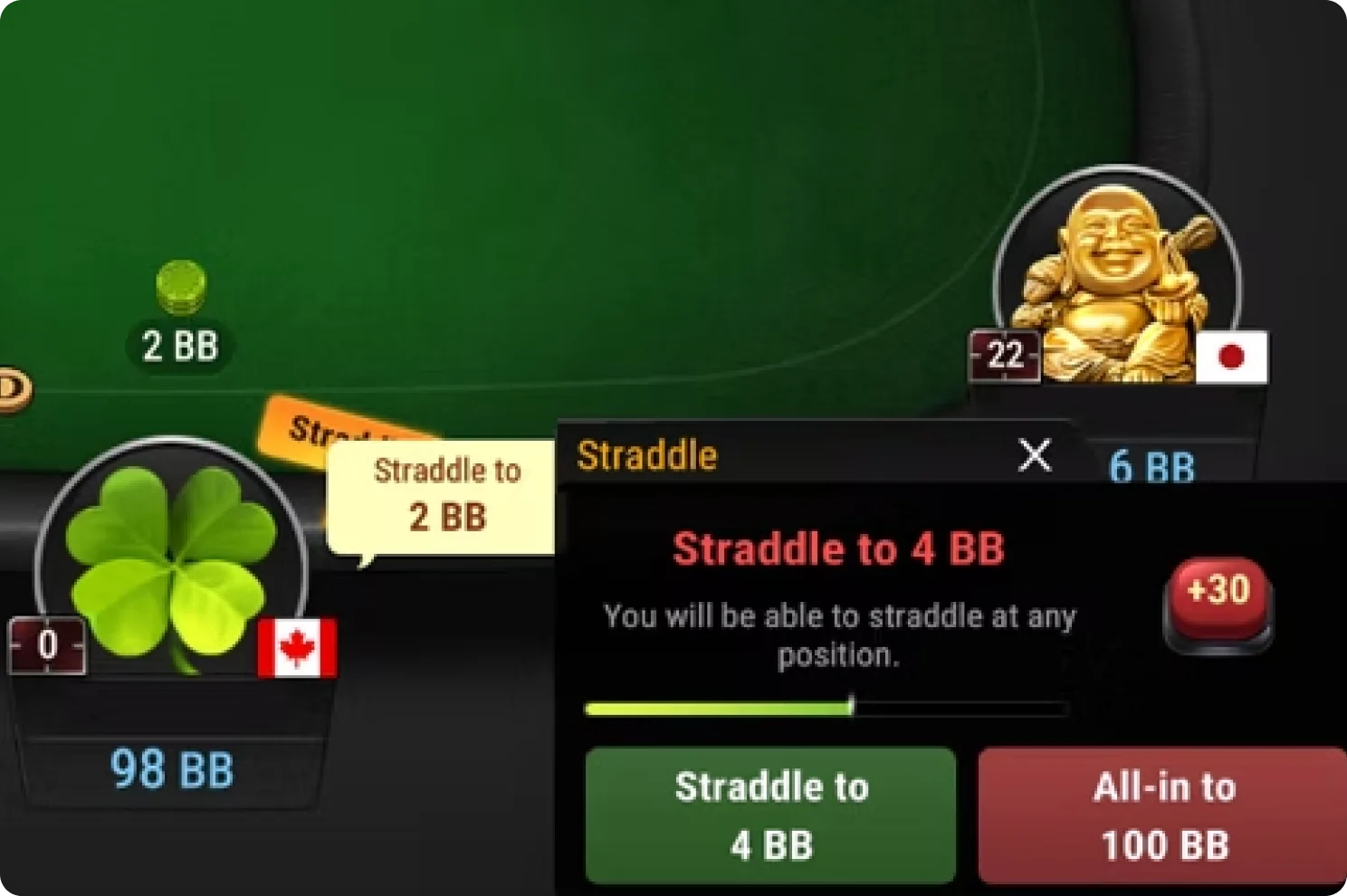 Una vez que la primera persona hace un straddle, se iniciará un temporizador esperando a que cualquier otra persona haga un straddle. Para hacerlo más emocionante, después de que se coloque la primera apuesta de straddle, todos los jugadores tendrán la opción de hacer un straddle o ir all-in. ¡Llamamos a esto el 'All-In a Ciegas' debido a que el jugador tiene otra opción de ir all-in incluso antes de que se repartan las cartas!