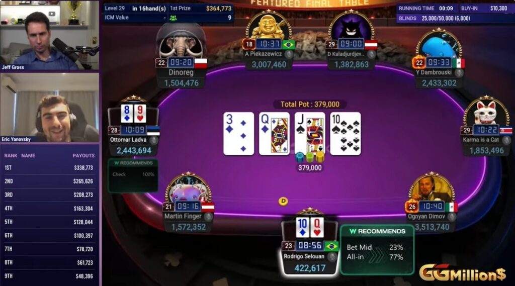 Tidak mengherankan, Selouan adalah pemain pertama yang meninggalkan aksi, tetapi tangan itu sendiri adalah klasik. (45:30) Mempertimbangkan taruhan di turn dari board yang menunjukkan Q-J-3-T, Selouan memegang two pair dengan queen-ten tetapi dihancurkan oleh eight-nine milik Ottomar Ladva. GTO Wizard menyarankan shove di jalan ke-4, tetapi Selouan bertaruh kecil sebagai gantinya. Ladva mengikuti saran dan melakukan shove. Selouan memanggilnya, membutuhkan queen atau ten untuk bertahan. Deuce di river mengakhiri harapannya untuk comeback, saat ia menguangkan $48,396.