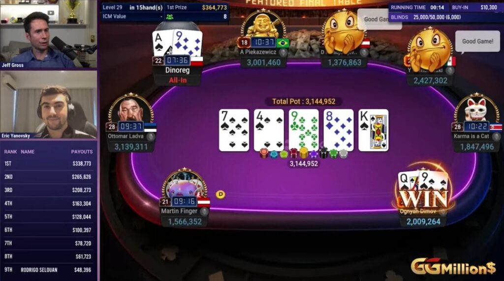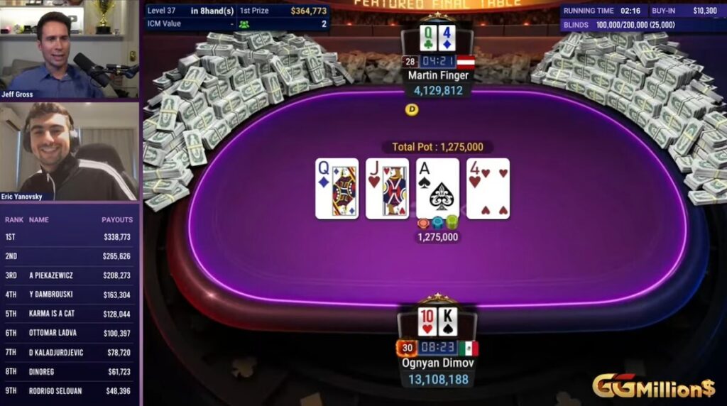 “Ini seperti Teddy KGB, ini Chan-Seidel!” tertawa Jeff Gross. Semua chip masuk dari Dimov di river dengan eight, dan Finger memanggilnya hingga kehancurannya, memberikan Dimov gelar GGMillion$ kelimanya dengan gaya!
