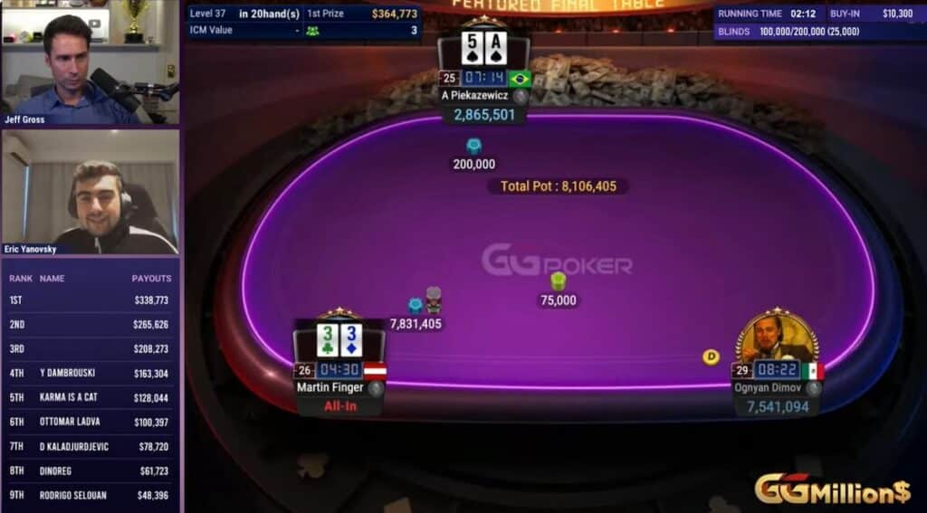 Pemain Bulgaria Ognyan Dimov memenangkan GGMillion$ minggu ini setelah pertunjukan dramatis di akhir yang membuatnya mengalahkan Martin Finger meskipun pemain Austria tersebut memiliki keunggulan besar dalam permainan heads-up. Dimov, yang memulai dengan chip terbanyak, mengakhiri permainan dengan semua chip setelah penampilan luar biasa, mengalahkan raja comeback setelah legenda lainnya tumbang di meja final.