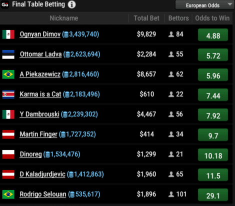 , lapangan yang sangat kompetitif melihat Ognyan Dimov dari Bulgaria memimpin dengan 69 big blinds, menjadikannya favorit taruhan di GGPoker dengan odds 4,88. Kedua dalam chip adalah pemain Brasil Alisson Piekazewicz dengan 56 big blinds, tetapi hanya bermain di 43 acara GGMillion$ dibandingkan dengan 166 yang diikuti oleh Ottomar Ladva di posisi ketiga. Tumpukan pemain Estonia sebesar 52 big blinds memberinya odds 5,72, sedikit lebih pendek dibandingkan dengan 5,96 yang ditawarkan untuk Piekazewicz.