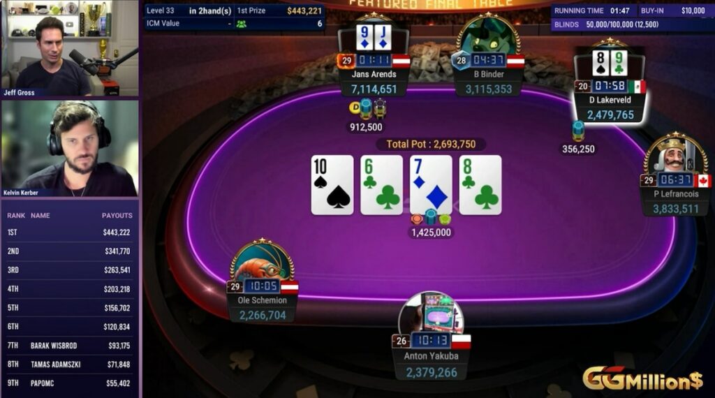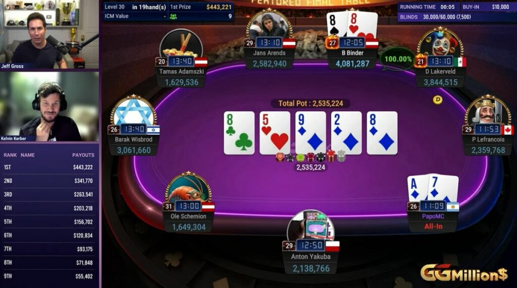 ‘PapoMC’ alias Alejandro Lococo tidak pernah benar-benar mulai panas di meja final dan, seperti yang terjadi, menjadi yang pertama bust, meraih $55,402 di peringkat kesembilan. (41:00) All-in di hand kedua malam itu setelah turn dengan ace-seven wajik, ia perlu membaik melawan pocket eights milik Bernhard Binder dengan papan menunjukkan 9-8-5-2 dengan dua wajik yang tersisa, membuatnya butuh keajaiban. Meski tampilan odds hand dalam klien GGPoker menunjukkan sang Argentina punya peluang 22.73% untuk memenangkan hand, wajik yang datang di fifth street malah mengirim Lococo ke pagar virtual. Itu karena itu adalah delapan terakhir di dek. Frasa ‘Death by Quads’ mengambil bentuk saat meja dan komentator sama-sama bereaksi dengan keheranan.