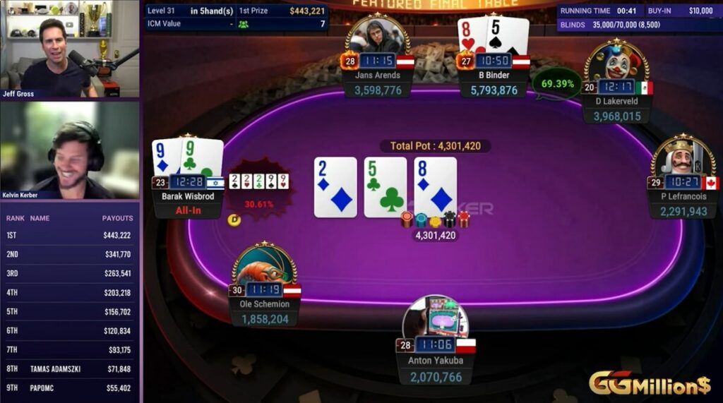 Memasuki aksi, ada nama yang sangat familiar di puncak chipcount. Profesional Austria Bernhard Binder lebih dari sekadar salah satu langganan meja final GGMillion$ mingguan dengan biaya masuk $10,000. Dia adalah juara WSOP Paradise Super Main Event 2025, sebuah ajang yang memberinya $10 million, serta pemenang event Triton Poker Series. Terbiasa dengan skor tujuh digit, tumpukannya sebesar 89 big blind menjadikannya favorit yang pantas untuk membawa pulang hadiah utama, dan ia tersedia pada odds menarik 4.08 di klien GGPoker.