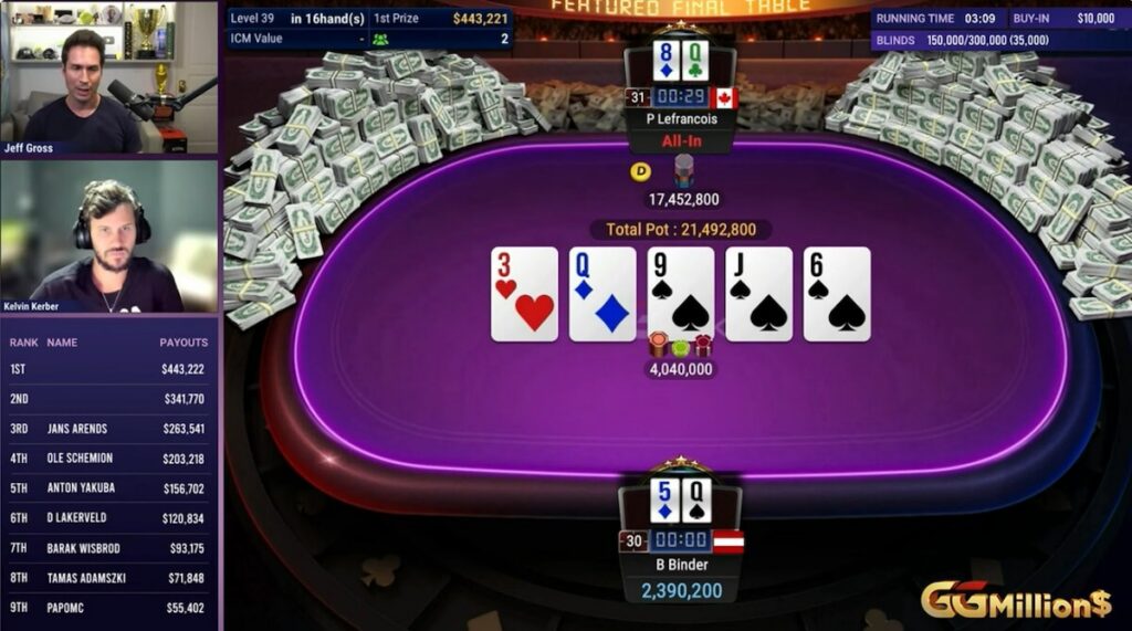 Turnamen GGMillion$ dengan biaya masuk $10,000 memilah yang baik dari yang hebat setiap pekan, namun meja final pekan ini benar-benar spektakuler. Pemain Kanada, Pascal Lefrancois, melompat dari tengah klasemen untuk menang dengan cara yang menakjubkan, dua kali mendapatkan pocket aces saat permainan short-handed untuk menumbangkan beberapa yang terbaik di bisnis ini dalam perjalanannya menuju kemenangan.