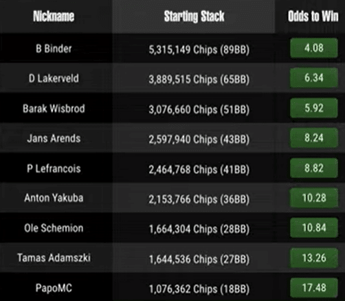 Di belakang pemimpin chip ada nama yang relatif baru, Daniel Lakerveld. Pemain Belanda itu memulai dengan 65 big blind dan bernilai 6.34 untuk menang, odds yang lebih panjang dibandingkan regular meja final Barak Wisbrod dari Israel, yang memulai final cukup tertinggal dengan 51 big blind di 5.92. Pemain Belanda kedua, Jans Arends, berada di peringkat keempat di papan peringkat (43BB/8.24) dan jelas seseorang yang bisa membuat kerusakan dengan tumpukan itu.
