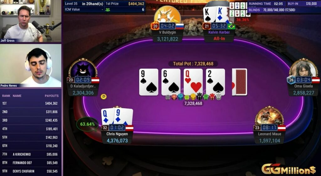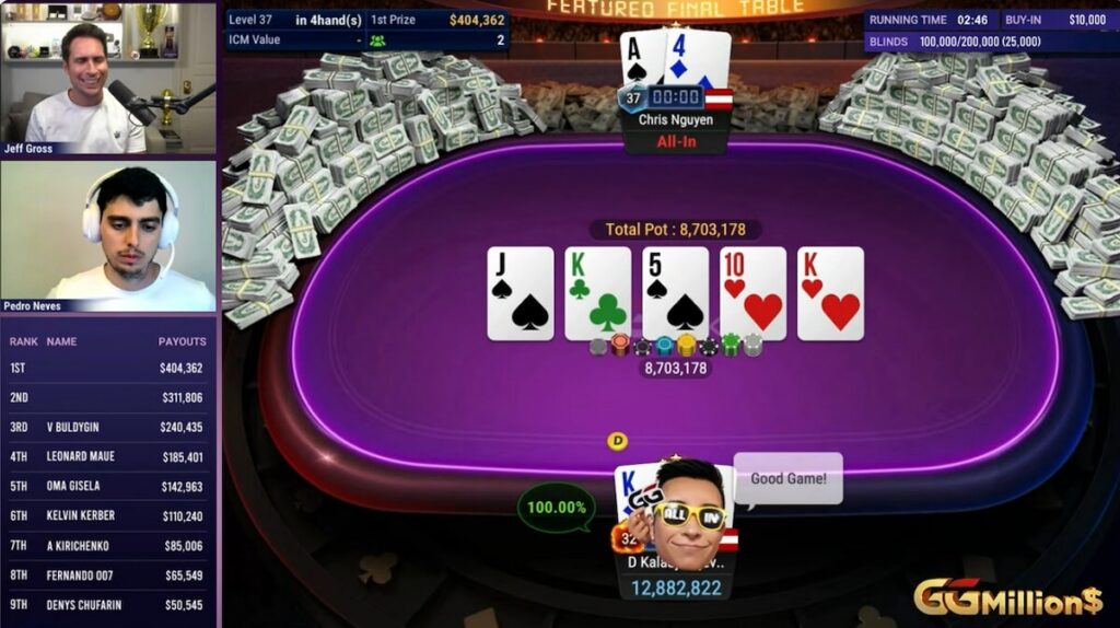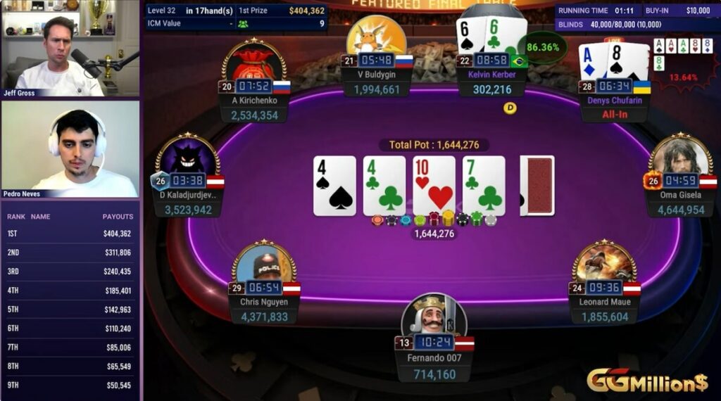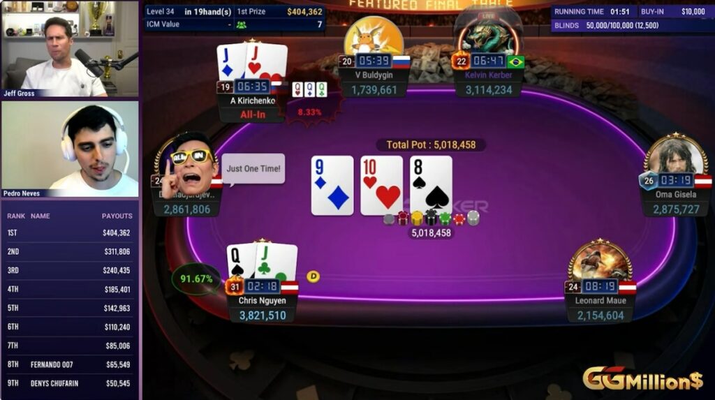 GGMillion$ terbaru meja final benar-benar seru, dengan Dejan Kalajurdjevic memimpin dari awal hingga akhir setelah beberapa pertarungan dramatis di felt digital. Dengan kehadiran legenda poker seperti Denys Chufarin, Christopher Nguyen, dan Leonard Maue, aksinya non-stop dari awal sampai selesai. Bergabung dengan host reguler Jeff Gross di boks komentar adalah pemain populer asal Portugal dan pemenang GGMillion$ minggu lalu, Pedro Neves, yang kehebatannya di turnamen ini sudah melegenda.