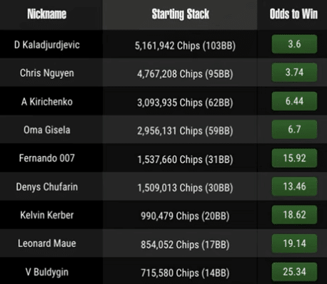 Kami menyukai peluang mantan pemenang GGMillion$ asal Ukraina dan ko-komentator Denys Chufarin. Memegang 30 big blind untuk memulai pertarungan, odds-nya 13,46 lebih pendek karena pengalamannya yang luas. Kelvin Kerber dari Brasil (20BB/18,62), Leonard Maue dari Jerman (17BB/19,14), dan pro Rusia Viacheslav Buldygin (14BB/25,34) berada di belakang dengan lebih banyak harapan daripada ekspektasi.