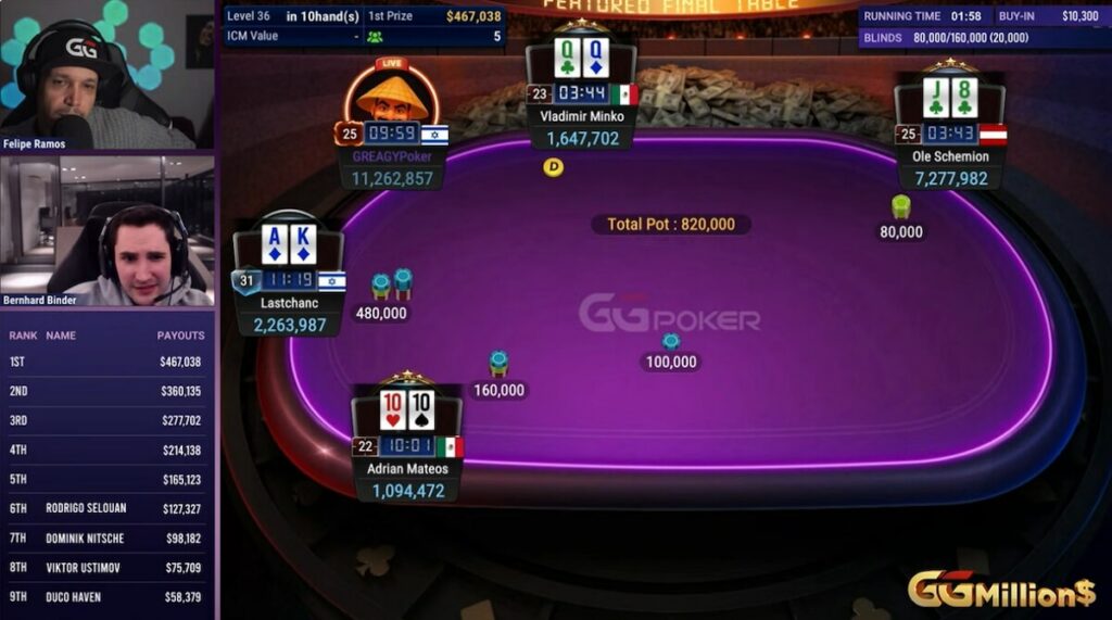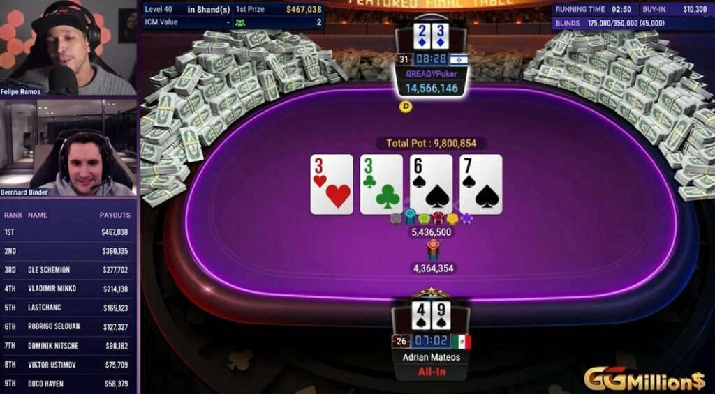 Lai gan ‘GREAGYPoker’ short stack uzvara nāca no nekurienes, lai sniegtu labāko no lupatām līdz bagātībām stāstu šogad, varētu apgalvot, ka Adriana Mateosa sniegums bija vēl labāks. Spāņu spēlētājs sāka ar nedaudz vairāk čipiem nekā ‘GREAGY’, bet vienā brīdī bija palicis ar astoņām lielajām obligātajām likmēm, turot kabatas desmitniekus. Atrast fold šajā izšķirošajā posmā bija nekas cits kā pārsteidzoši, un gan Ramos, gan Binders izteica komplimentus savam kolēģim profesionālim par izcilu spēli.