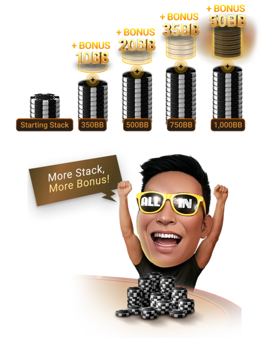 • Each target stack reward (e.g. 350BB, 500BB, 750BB, 1000BB) is limited to once per day per blind level, regardless of how many times the target stack is reached.
