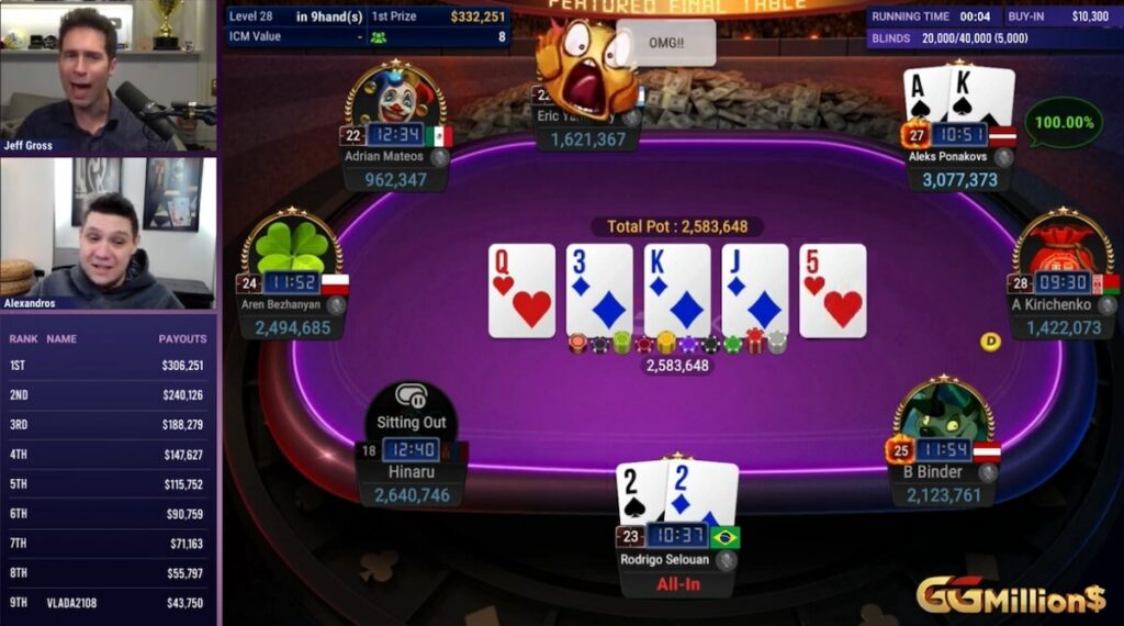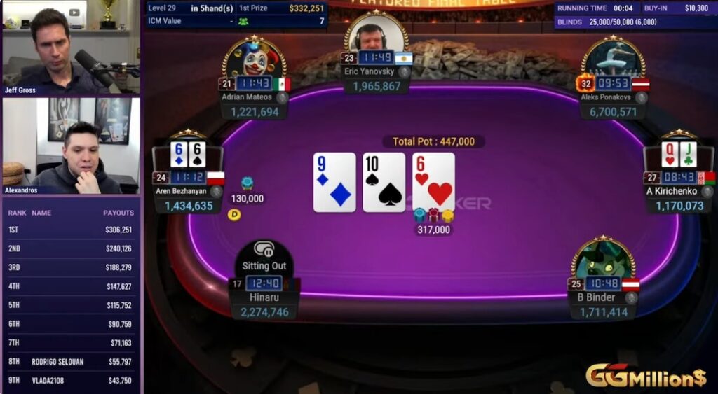 Ponakovs和Mateos都是绝佳选择,因为他们对这一赛制有着丰富的知识,并且之前曾赢得过GGMillion$赛事。比赛在常规主持人Jeff Gross和希腊扑克职业选手Alex Theologis的陪伴下开始,后者是即将上映的GGPoker纪录片《线上扑克百万富翁》的主角。