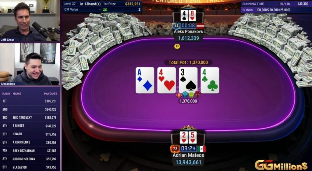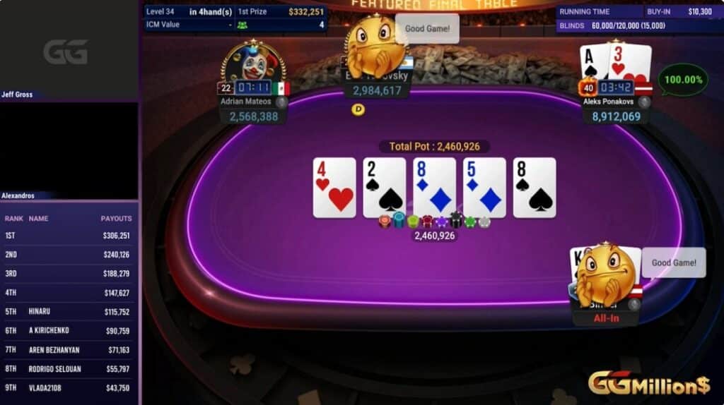 Adrian Mateos和Aleks Ponakovs之间总共拥有九个GGMillion$冠军,而其中一人即将再次夺冠。最终两人如我们赛前预测般进入单挑争夺冠军,Mateos以4:1的筹码领先,最终手牌成为比赛的高潮。