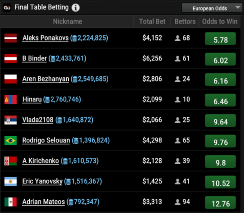 奥地利选手Bernhard Binder的赔率更低,为6.02,尽管他只有61个大盲。我们同意投注公众的看法,Aleks Ponakovs以5.78的赔率成为夺冠热门,尽管他以56个大盲开始比赛。
